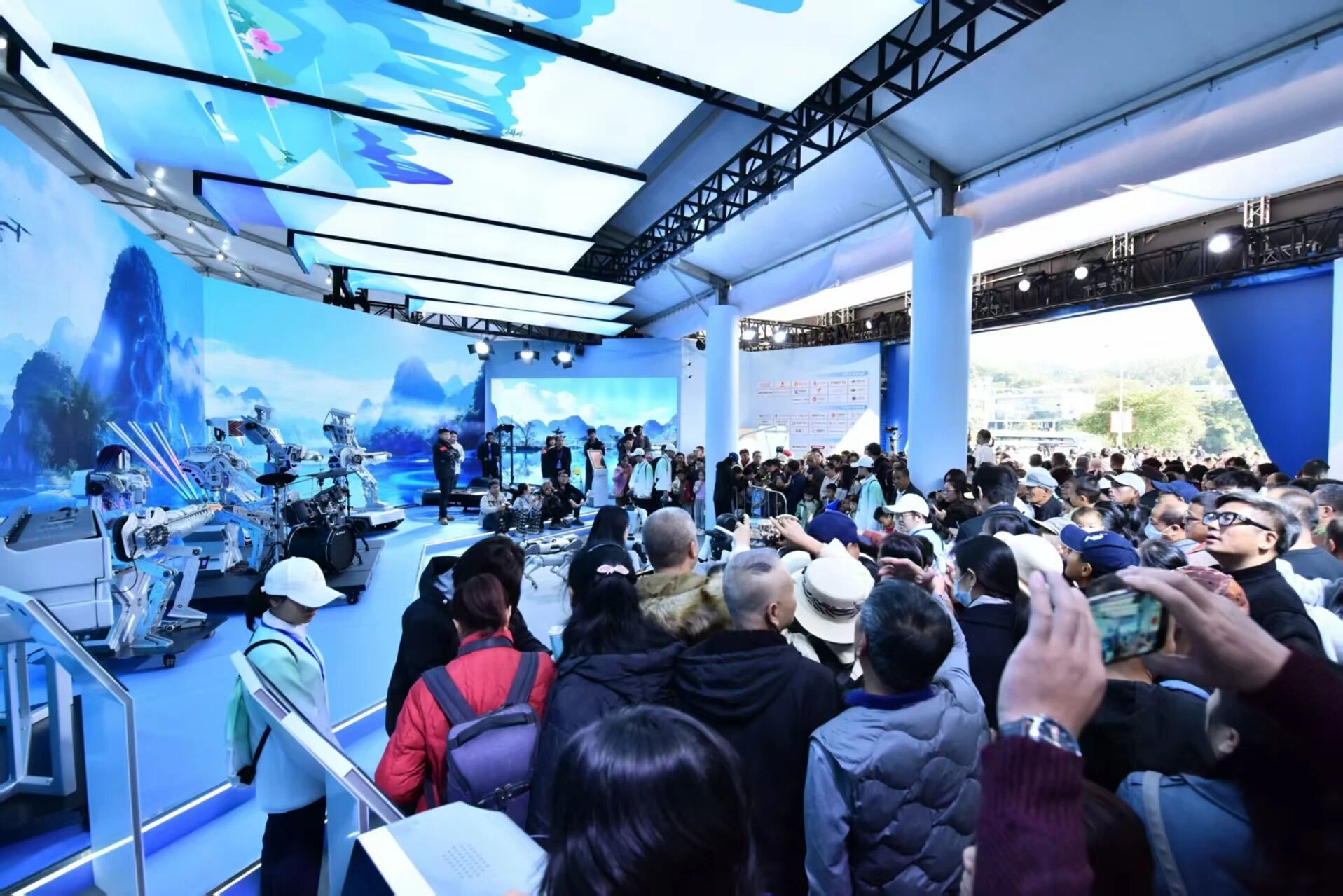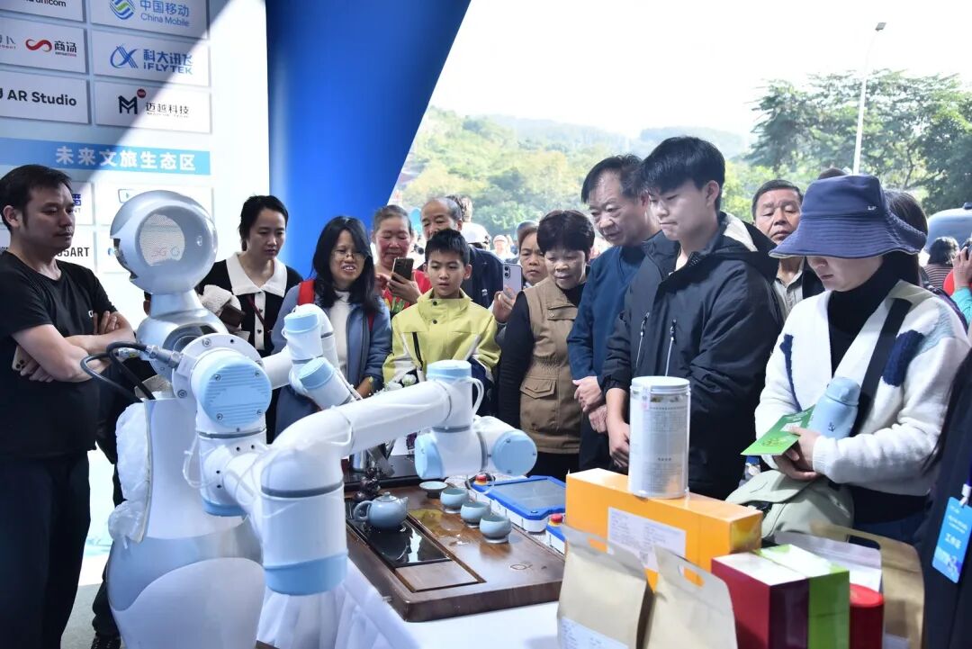 沏茶机械人现场展现置茶、洗茶、冲泡、出汤及清洗的全流程操做,机械人乐队表演区里围不雅市平易近热情高涨,